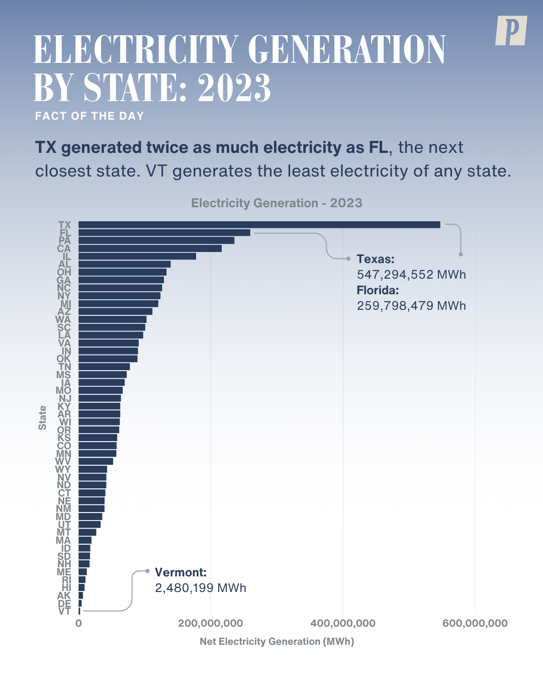 How much electricity do states produce? In 2023, Texas generated twice as much power as Florida, the next closest state. At the other end of the spectrum, Vermont produced the least electricity and had the lowest per capita generation rate. Explore the data on US DataLabs! https://loom.ly/-trkbR4