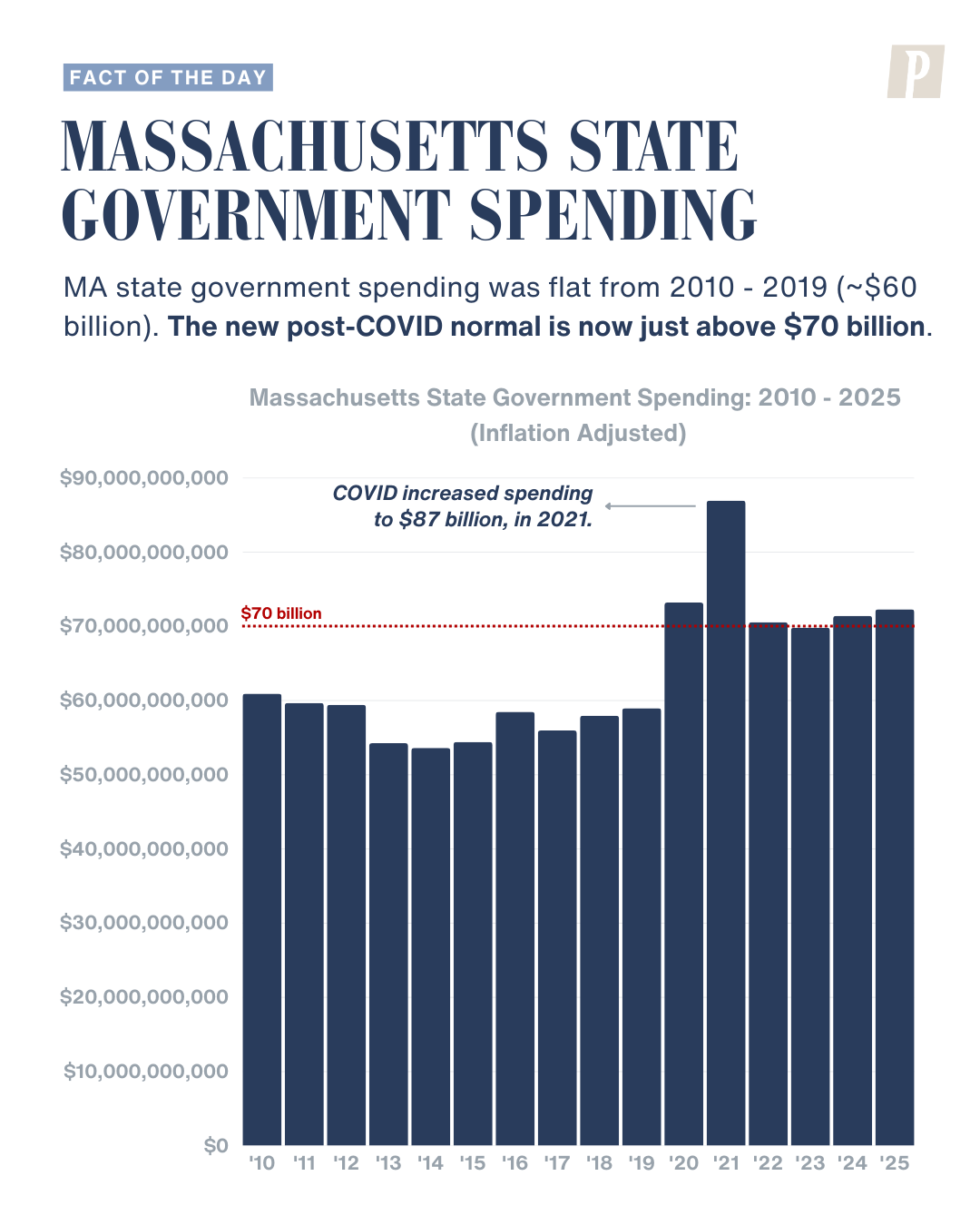 Did you know? After adjusting for inflation, Massachusetts state government spending didn’t grow at all from 2010–2019 — it held steady at about $60 B. Then came COVID, which pushed spending up to $87 B in 2021. Today, the new post-COVID normal sits just above $70 B. Explore the full trend on the MA DataLabs site: