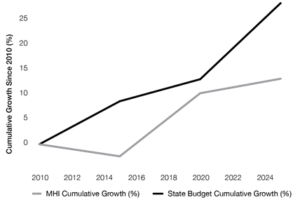 Figure 7. Cumulative Growth: MHI vs MA State Budget, 2010-25 (2025$)