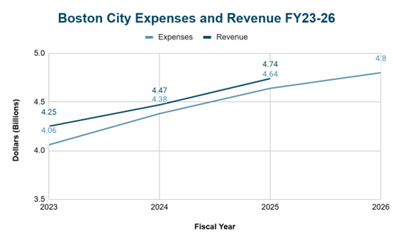 Figure 4: City of Boston total expenses and revenue from FY2023-2026 in millions of dollars. Data sourced from Pioneer’s Boston DataLabs.