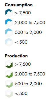 Figure 3: Total energy production and consumption by state in 2023 per tBtu. Data is from the Energy Information Administration.