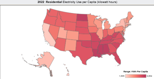 Figure 4: 2022 Residential electricity use per capita (kilowatt hours) in the United States. Data is from Pioneer’s US DataLabs.