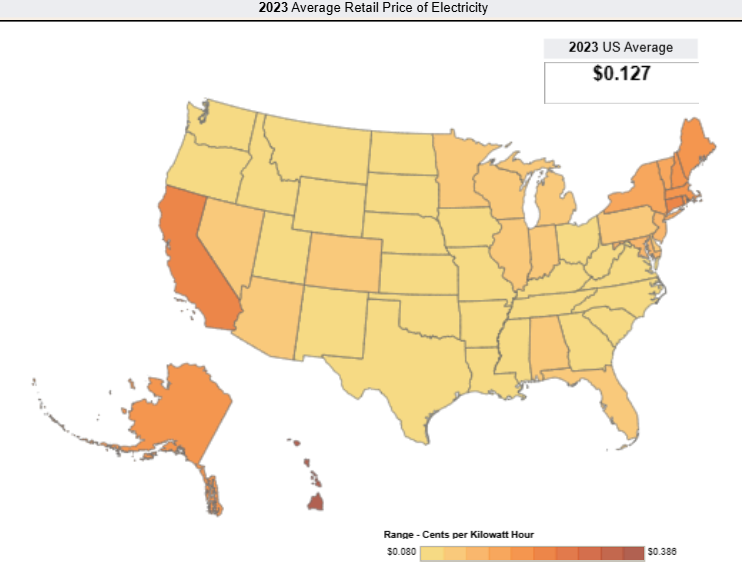 Figure 6: 2023 average retail price of electricity nationwide per cent / kilowatt hour. Data is from Pioneer’s US DataLabs.