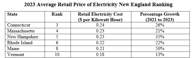 Since 2015, Massachusetts has consistently been among the five states with the highest average retail energy price. In 2023, the national average retail price of electricity was $0.13 per kilowatt hour. New England’s prices were higher, with Connecticut at $0.24, Massachusetts $0.23, New Hampshire $0.23, Rhode Island $0.22, Maine $0.21, and Vermont at $0.18. As seen in US DataLabs, many states have followed a fairly linear trend while New England states have seen a sharp increase in the average retail electricity price since 2021.