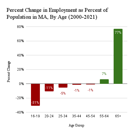 However, employment trends among the oldest demographic of workers are not solely responsible for the aging of the workforce, as declining labor participation from younger age demographics are also partly to blame. Every age category younger than 55 experienced a net decrease in employment as percent of the population between 2000 and 2021, while the 55-64 year old age group saw a 6.52 percent increase and the 65 and older population saw a 77.12 percent increase during those same years.