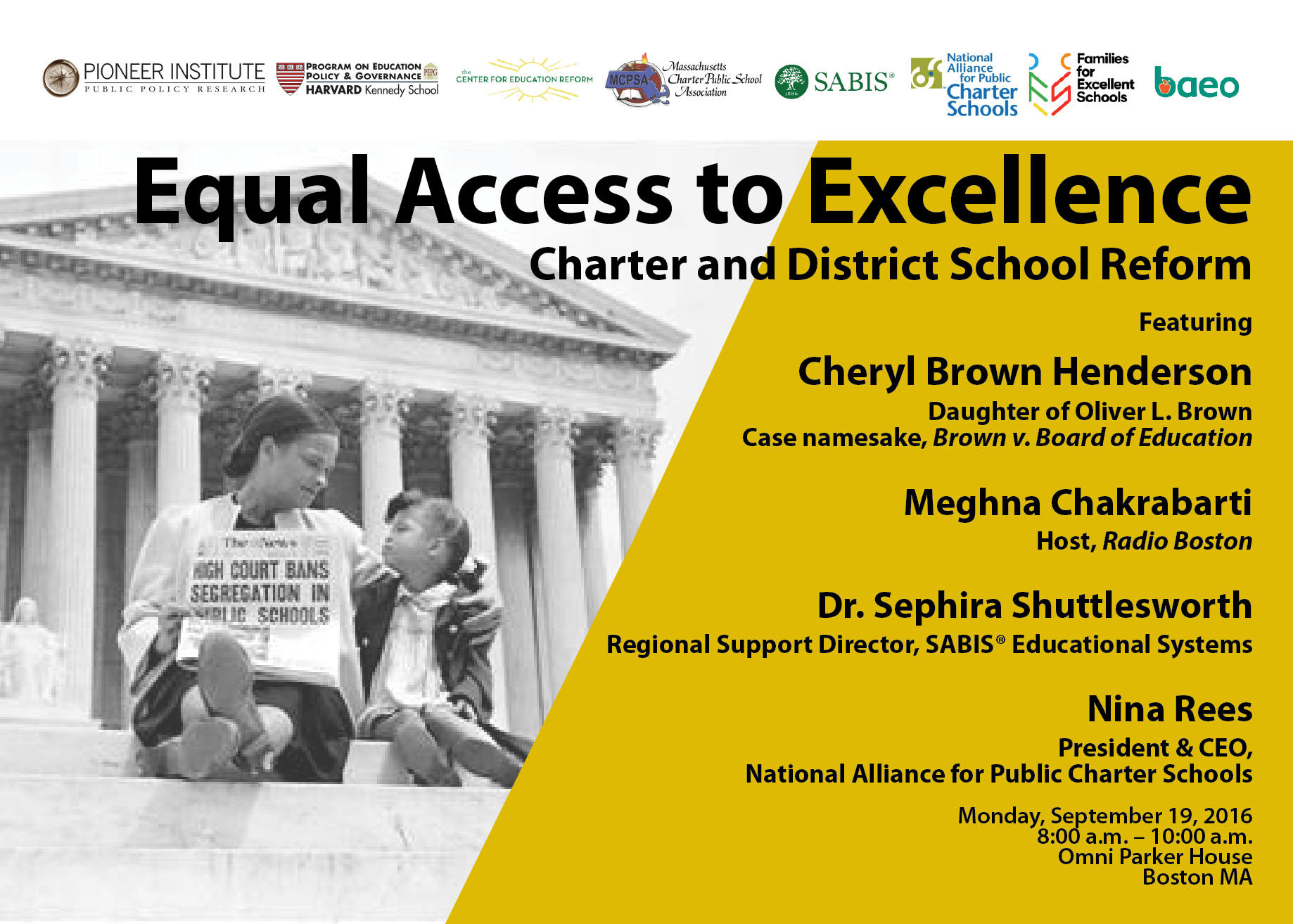 As the Commonwealth debates lifting charter school caps, district reforms, and strategies for closing achievement gaps, Pioneer is hosting an event featuring Cheryl Brown Henderson, daughter of the late Rev. Oliver Brown, namesake of the landmark case, Brown v. Board of Education. A diverse...