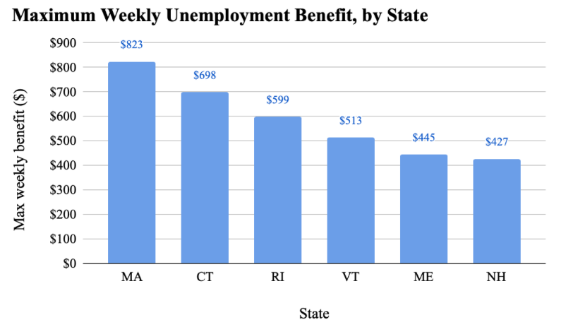 Benefits are calculated similarly across all the six states: wages are averaged over a base period, which is usually two to three of the quarters in which the most was earned out of the past five quarters. That figure is divided by the number of weeks benefits would be received, which is usually somewhere between 22 and 26. However, all six states that make up New England have different maximum weekly benefits.