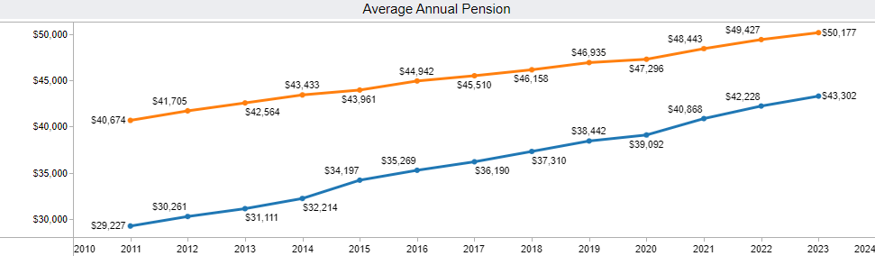 The Teachers Retirement System paid over $3.4 billion in pension payments to former teachers and administrators in 2023. The fund paid an average pension of $50,177 to 68,773 retirees. The State Employees Retirement System paid over $2.7 billion to their 64,297 retirees last year. The fund’s average pension payment was $43,302. Over time, the total pension expense and average pension payment for both funds have steadily increased.